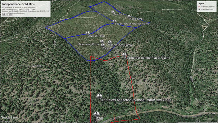The Independence property also boasts a large mill which was in production as late as 1942 when it was completely rebuilt. Today it is largely collapsed and unusable. There are considerable tailings, of which some are working into the creek in the form of fine black sands with some fleck gold.