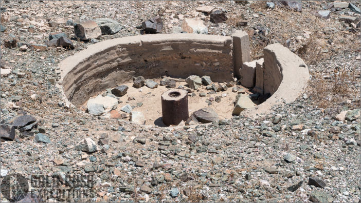 The mine camp is established below the main haulage portal on the property. There is very little left, remains of a gear driven arrastra and a few foundations for machinery.