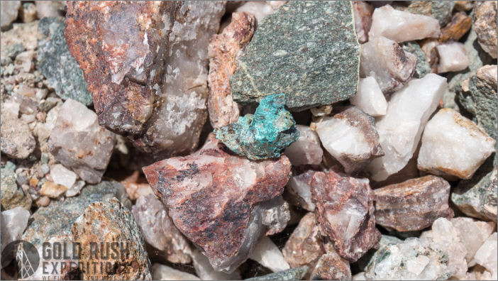 Gold is found in native form in some of the waste dumps on the site. It is in small specks but not microscopic. It is assumed to have been discarded as more valuable ores were being developed on the Rainbow and Roosevelt veins. The apex of both of the aforementioned veins are contained on the Roosevelt Mining Claim.