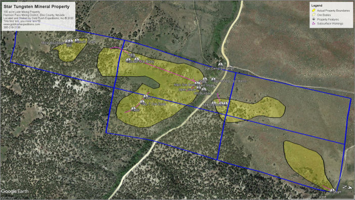 The Star Mineral Property is a one hundred (100) acre lode mining property located in the Harrison Pass district, outside of Elko, Nevada. The Star property, as it exists in this space, spans across the entire tungsten deposit in the canyon. Historically some of the edges of the deposits have been worked by small scale operations such as the Climax and the Slipper Mines, but in 1960, they were all brought together as the Star Mining Property.