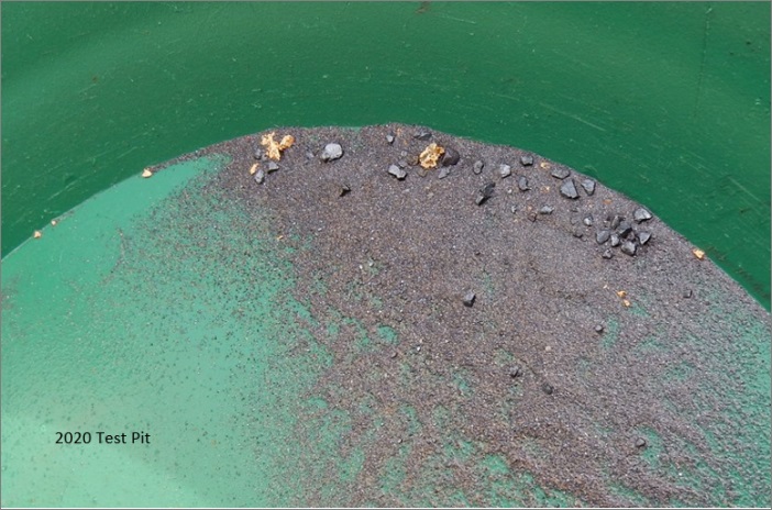 Gold results from a small test pit in 2020 were quite promising with several coarse gold pieces recovered along with substantial coarse grained heavy minerals. Road access has been improved so that a pickup can be driven all the way to the Alex 3 claim, with ATV access after that.