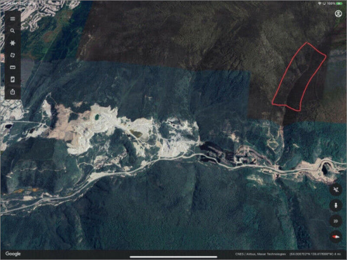 Potential for White Channel Gravel bench deposits on hillsides. Geophysics shows 8-10 feet to bedrock at lower end of claim block.