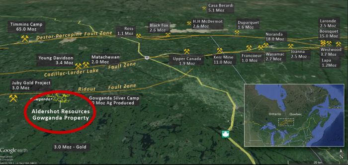 The Gowganda property consists of 34 unpatented mining claims comprising of 220-16 ha units covering an area of approximately 3,520 hectares. This area is located alongside the Ridout Fault which is one of the three main faults that runs through the entire Abitibi Greenstone Belt. This fault produced over 3 million ounces of gold over 70 million ounces of silver. Exploration on this property along this fault has turned up some very impressive results to date such as gold values up to 97.6 g/t gold in grabs, with channel