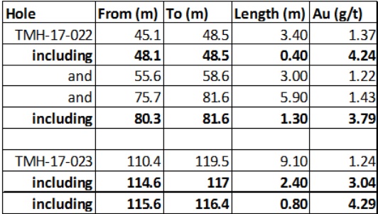 In February the company started a drilling campaign and to date two holes have been logged and assays returned. The table below shows the recorded results from the two drill holes.