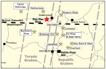Before I get started I would like to point out the map in the picture above. See the May Mac mine? It's the one with the red star and it owned by Golden Dawn Minerals. Golden Dawn Minerals GOM is a small junior company that has the old May Mac Mine in the Greenwood mining district of British Columbia. The original May Mac showing, discovered and staked in 1894, was developed by several shafts and three adit tunnels. Some 32 tonnes (metric) (35 tons) of mineral were shipped over the subsequent nine years, grading 319 grams per tonne (g/t) gold (9.3 ounces per ton [oz/ton]). By 1904, a new parallel vein, termed the Upper Skomac, was discovered, developed by a new adit tunnel (Adit #4) and mined, sporadically yielding 670 tonnes (790 tons) over the ensuing 33 years, grading in the range of 3,000 g/t (100 oz/ton) silver.
