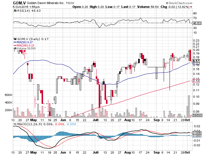 Golden Dawn has around 36 million shares O/S plus around 19 million warrants. Management & directors own about 12%. A quick look at the chart above will tell you things have been getting a bit active and with a good turn in gold prices, this could be an exciting play. his is also a play that is not at 52 week lows like so many other juniors we see out there.