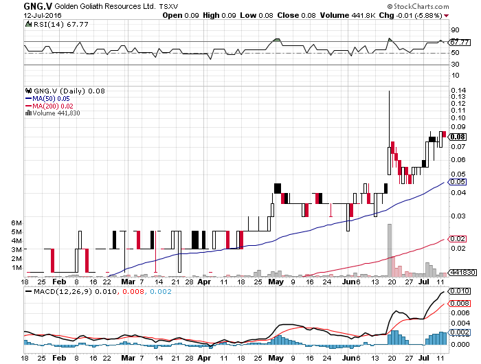 Golden Goliath has just over 100 million shares O/S. With a 52 week high of 14 cents and low of just 1/2 cent the stock at this time is at 8 cents.