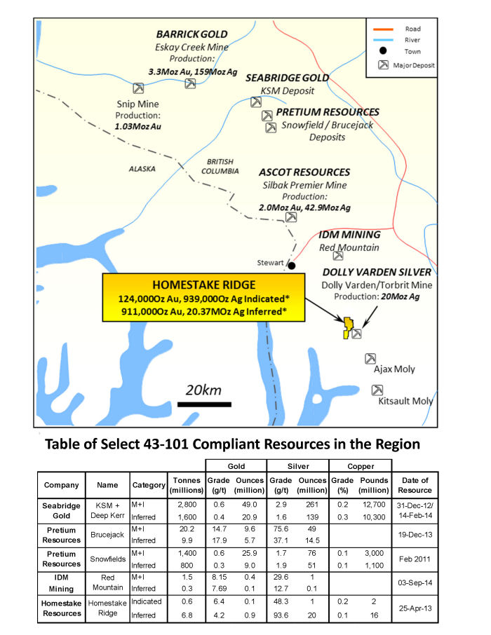 One of the companies that has holdings in this area is Homestake Resource HSR. The Company's primary asset is the Homestake Ridge Project, a gold-rich epithermal/VMS-related vein system hosted within Eskay Creek equivalent stratigraphy, with three deposits containing NI 43-101 compliant resource estimates. Since acquiring the property in 2003, 77,946 meters of exploration and delineation drilling have been completed, leading to the identification of a NI 43-101 compliant mineral resource estimate of 124,000oz gold and 939,000ozs silver indicated plus 911,000ozs gold and 20,366,000ozs silver inferred at an $85NSR cut-off in three separate deposits.