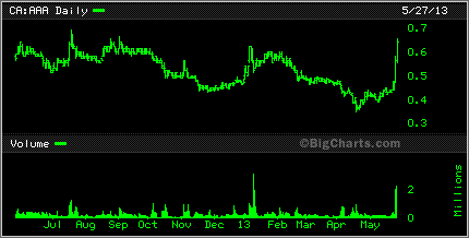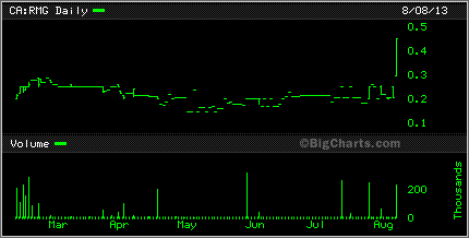 Rainmaker Mining Corp. will undertake a non-brokered private placement to raise up to $200,000 by the issue of up to one million units at a price of 20 cents per unit. Something to keep in mind about Rainmaker is that that there are only 9 million shares so that is one of the reasons for the 100% plus pop on the day.