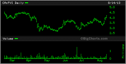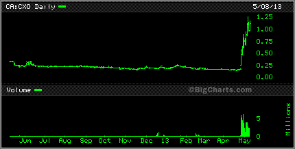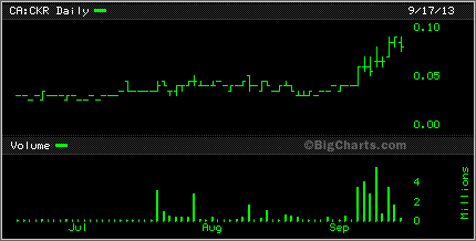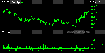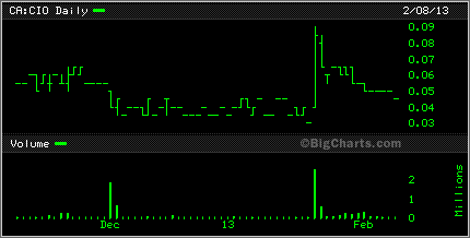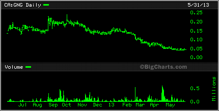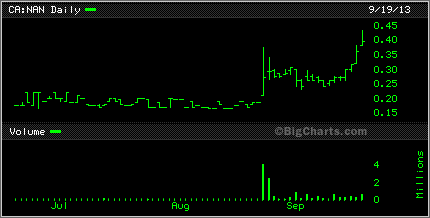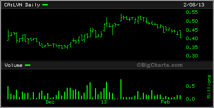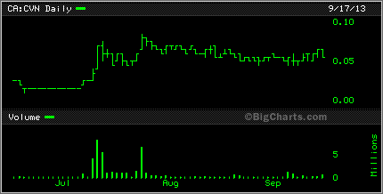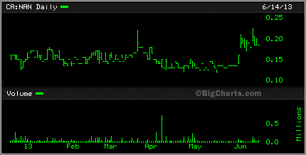 Speaking of graphite, Canada Carbon CCB was up 25% today. it too has been on a wild slide downward but seemed to bounce back today. Caribou King CKR had a bit of a bounce also today, up 1.5 cents to 6.5 cents while Cavan Ventures CVN found itself sitting on lows.