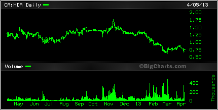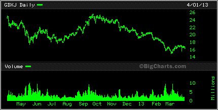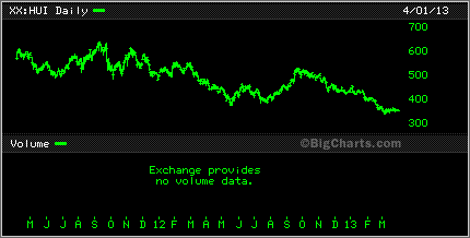 After being away for the entire month of March, it's good to be back at the website doing some kinds of updating. Too bad there just wasn't a bunch of good news to tell everyone about the state of the junior mining industry. One quick look at a chart of the HUI, the Gold Bug Index and you can see that things are well on the downward slope and have been for the beter part of 2012 with little changes for the first quarter of 2013.
