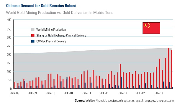 Ever wonder who is uying all that gold that is selling cheaply into the market? Some say it is central banks while others claim it is China. Looking at the chart below we can see that in fact China is the biggest buyer of gold in the world today. In fact they buy almost all the gold that is mined today. Ever wonder why they are buying all that gold? As a gold bug I sure do. Notice how little presence the COMEX has. A mere pitance.