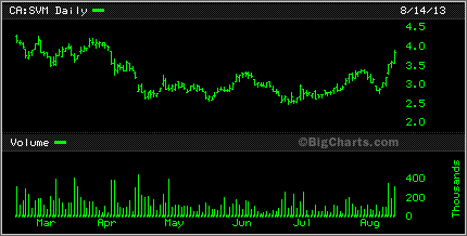 With the silver price rebounding, some of the silver miners are taking off. Had you bought Silvercorp SVM last week you would be up a tidy $1 buck a share. Not to shabby for a stock that was inder $3 bucks.