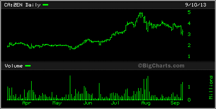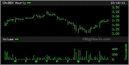 Zenyatta ZEN has sure been on a wild ride. Below is a 10 day hourly chart or trading activity. There is probably a lot of short postions on this play after the article published by Street Sweeper a while back. Surprisingly this stock has held up well.