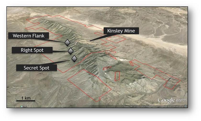 The company's exploration strategy is focused on identifying additional areas of high-grade mineralization in the Secret Canyon Shale horizon, especially targeting the Kinsley North claims which have never before been drilled. Drilling at the Secret Spot target, located two kilometres to the south of the Western Flank target, resulted in the discovery of a thick zone of gold mineralization in the Secret Canyon shale, which is the same host for high-grade mineralization in the Western Flank. The existence of gold mineralization in the same unit two kilometres from the Western Flank suggests that mineralization could be wide-spread in this unit; follow up drilling is planned to test the extent of gold mineralization in this area.
