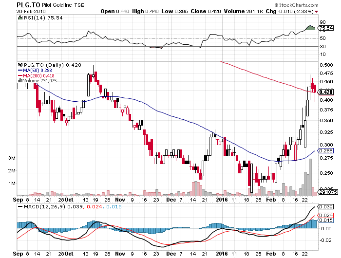 Just this past week Pilot Gold issued a news release about a new appointment of CEO along with $4.45-million PP. The company has around 110 million shares O/S and the PP will account for an aditional 17 million. Shares prices have seen a 22 cent low and $1.10 high for the past 52 weeks. In 2011 the stock prices was as high as $3.50.