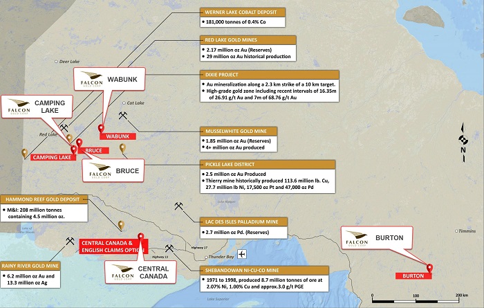 As I mentioned Falcon Gold has multiple properties in Ontario as you can see by the image below. There is the Central Canada Gold & Polymetalic Project which covers more than 10 km of highly prospective Quetico Fault Zone and has a history of gold production. The Wabunk Bay Copper and Nickel is located within the Birch-Uchi-Confederation Lakes greenstone belt. This is the same mineral belt that host the Dixie deposit that Great Bear is working.