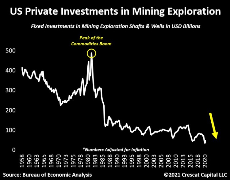 After seeing the performance of most mining stocks lately one can understand why a lot of long term investors have been throwing in the towel and taking their money elsewhere. I wrote in the past article here that a lot of old gold bug money held in family trusts was being taken out and going into the digital space of crypto currencies like bitcoin. One only has to look at data and charts like the one posted below that money for metal mining has been falling steadily. Some would argue that news mines are not needed like before because of new technologies in recycling of these metals. Those people who argue the recycling gig are only partially true because as the world continues to grow and expand, so do the materials needed for the infastructure.