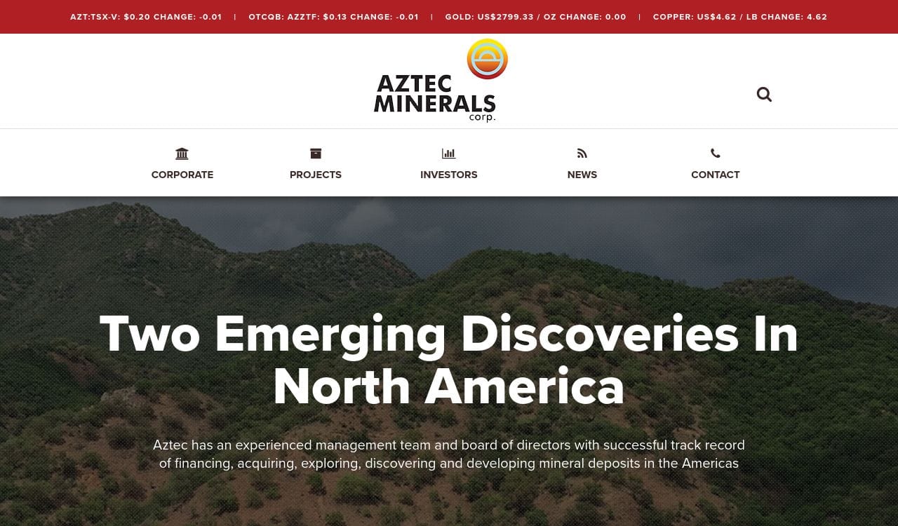 Aztec Minerals Corp is a Canadian mineral exploration company that focuses on the discovery and development of precious and base metals deposits in North America. The company's flagship project is the Cervantes gold-copper project located in Sonora, Mexico. Aztec Minerals also has a joint venture with Kootenay Silver Inc. on the Cervantes project, where Kootenay Silver holds a 60% interest and Aztec Minerals holds a 40% interest. The company's other projects include the Tombstone project in Arizona, USA, and the prospective gold-silver-lead-zinc-sulfide targets in the prospective Tombstone-Sonora Mega-Region. Aztec Minerals was founded in 1981 and is headquartered in Vancouver, Canada.