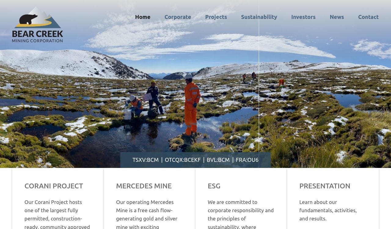 Bear Creek Mining Corporation is a Canadian mining company that focuses on the exploration, development, and production of precious and base metals in Peru. The company's flagship project is the Corani silver-lead-zinc deposit located in the Puno region of southern Peru. The Corani project is one of the largest undeveloped silver deposits in the world, with estimated reserves of 225 million ounces of silver, 2.7 billion pounds of lead, and 1.8 billion pounds of zinc.