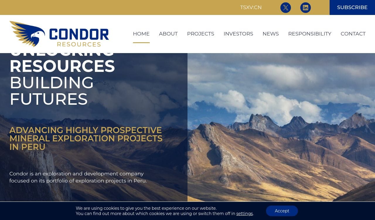 Condor Resources Inc. is a mineral exploration company based in Vancouver, Canada. The company is focused on exploring and developing mineral properties in South America, with a particular emphasis on Peru. Condor Resources has a portfolio of projects that includes gold, silver, copper, and zinc properties. The company's flagship project is the Soledad project, which is located in the Ancash region of Peru. The Soledad project is a high-grade gold and copper project that has the potential to become a significant producer. Condor Resources is committed to responsible exploration and development practices and works closely with local communities to ensure that its activities have a positive impact on the environment and the people who live in the areas where it operates.