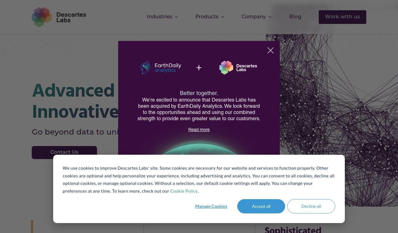 Descartes Labs is a geospatial data analytics company that uses satellite imagery and machine learning to provide insights and predictions about the Earth's surface. The company was founded in 2014 and is based in Santa Fe, New Mexico. Descartes Labs offers a cloud-based platform that allows users to access and analyze large amounts of geospatial data, including satellite imagery, weather data, and other environmental data. The platform uses machine learning algorithms to identify patterns and trends in the data, which can be used to make predictions about things like crop yields, weather patterns, and natural resource availability. Descartes Labs serves a variety of industries, including agriculture, energy, and government.
