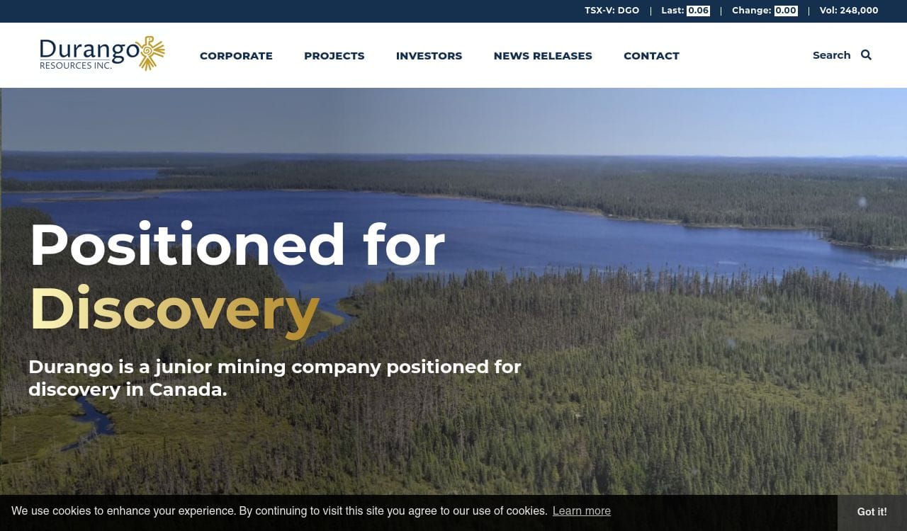 Durango Resources Inc. is a Canadian exploration company that focuses on the acquisition and exploration of mineral properties in Canada. The company's primary focus is on exploring for gold, silver, and other precious metals, as well as base metals such as copper, zinc, and lead. Durango Resources has a portfolio of properties in Quebec, including the Trove and Windfall Lake properties, which are located in the Abitibi Greenstone Belt. The company also has a property in British Columbia, the Mayner's Fortune property, which is located in the Skeena Mining Division. Durango Resources was founded in 2006 and is headquartered in Vancouver, British Columbia.