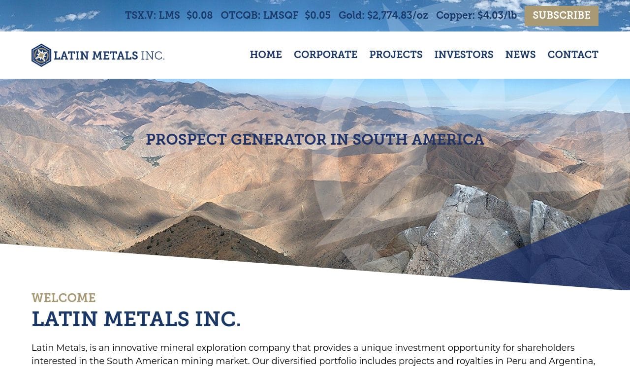 Latin Metals Inc. is a Canadian mineral exploration company that focuses on the acquisition and exploration of mineral properties in South America. The company's primary focus is on gold, silver, copper, and other base metals. Latin Metals has a portfolio of projects in Argentina, Peru, and Brazil, and is actively exploring and developing these properties. The company's goal is to discover and develop high-quality mineral deposits that can be economically mined and processed. Latin Metals is committed to responsible and sustainable exploration practices, and works closely with local communities and stakeholders to ensure that its activities have a positive impact on the environment and the people who live in the areas where it operates.