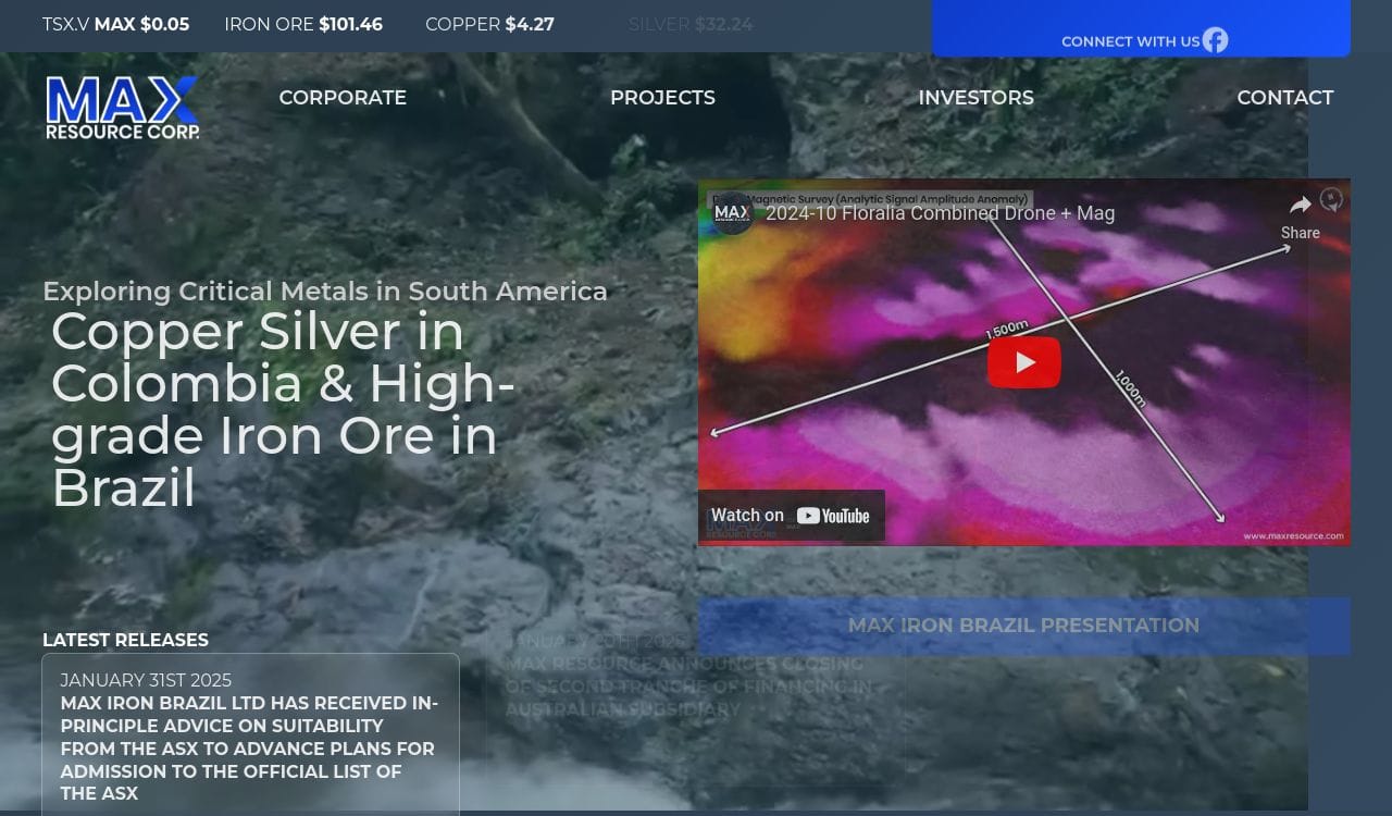 Max Resource Corp is a Canadian exploration company that focuses on the acquisition and exploration of mineral properties in Colombia. The company's primary focus is on copper and gold exploration, with a particular emphasis on the Choco Precious Metals Project in western Colombia. Max Resource Corp is committed to responsible and sustainable exploration practices, and works closely with local communities and stakeholders to ensure that its activities have a positive impact on the environment and the people who live in the areas where it operates. The company is listed on the TSX Venture Exchange under the symbol MXR.
