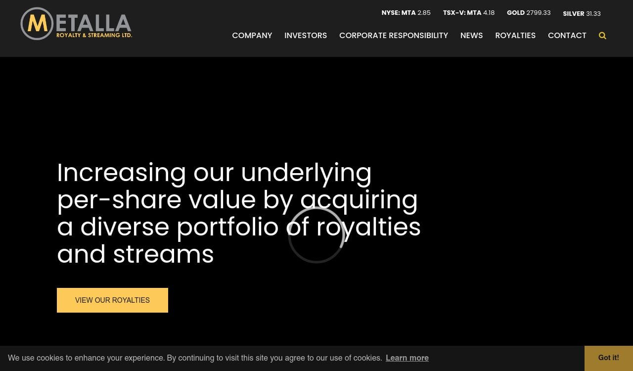 Metalla Royalty & Streaming Ltd is a precious metals royalty and streaming company that acquires and manages royalties and streams on gold, silver, and other precious metals mining projects. The company was founded in 1983 and is headquartered in Vancouver, Canada. Metalla's portfolio includes royalties and streams on mining projects in Canada, the United States, Mexico, Peru, and Australia. The company's business model is to acquire royalties and streams on mining projects in exchange for upfront payments and ongoing royalties or streams on the production of precious metals. Metalla's goal is to provide investors with exposure to the precious metals sector through a diversified portfolio of royalties and streams.