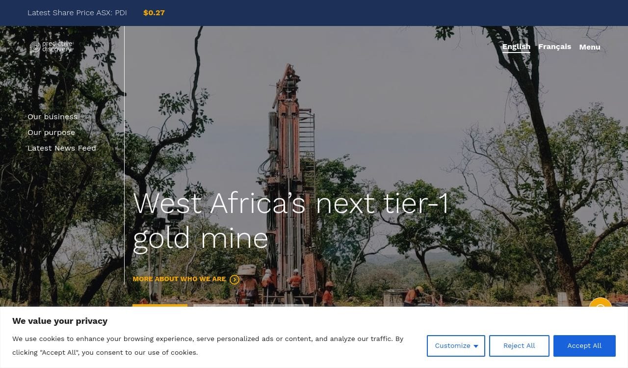 Predictive Discovery Limited is an Australian-based mineral exploration company that focuses on discovering and developing gold deposits in West Africa. The company's primary focus is on its flagship project, the Bankan Gold Project in Guinea, which has shown significant potential for high-grade gold deposits. Predictive Discovery Limited uses advanced exploration techniques and technologies to identify and evaluate potential gold deposits, and has a team of experienced geologists and mining professionals to manage its exploration and development activities. The company is listed on the Australian Securities Exchange (ASX: PDI) and has a market capitalization of approximately AUD 70 million as of August 2021.