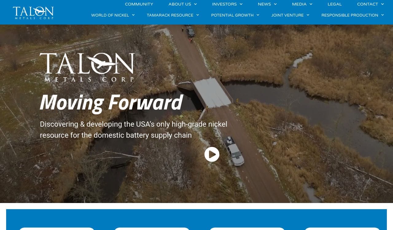 Talon Metals Corp is a Canadian mineral exploration and development company focused on the exploration and development of the Tamarack Nickel-Copper-Cobalt Project in Minnesota, USA. The company was founded in 2007 and is headquartered in Road Town, British Virgin Islands. Talon Metals Corp is listed on the Toronto Stock Exchange (TSX) under the symbol TLO and on the OTCQB Venture Market under the symbol TLOFF. The Tamarack Project is a high-grade nickel-copper-cobalt sulphide deposit located in the Duluth Complex, which is one of the world's largest and most prospective mineralized intrusions. The project has a current resource estimate of 3.5 million tonnes of nickel, copper, and cobalt. Talon Metals Corp is committed to responsible and sustainable mining practices and has a strong focus on environmental, social, and governance (ESG) initiatives.