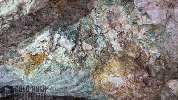 The primary mine workings are cut intercepting and opening the Roosevelt vein, which is gold bearing, copper stained quartz with some iron showings in a granordite type host rock. There is visible gold in small quantities noticeable inside the vein in the quartz. Exploration of the vein and definition of the boundaries of the vein would likely yield positive results. These main workings consist of a large, stable adit which intercepts at least four (4) shafts and or open stopes. Open stopes showing where the vein was worked to the surface. The shafts were not explored for drift levels or more information on the vein limits. Total estimated linear workings seen at in this complex is 1200’. This does not account for shafts and stopes. There are likely other drift levels inside the shafts that are not mapped or explored for mineral content.