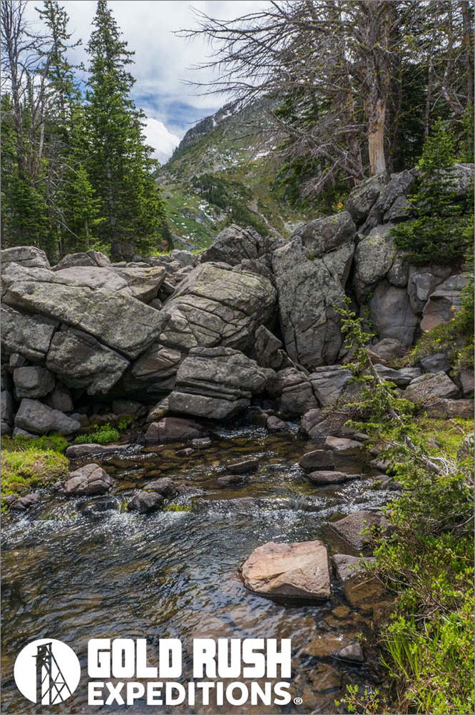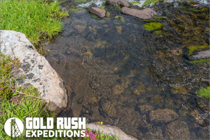 The McKelvey is placed right in the center of the gold producing zone in the canyon. Coming down from the Frisbee Mine up on Mine Lake, the river washes down into McKelvey Lake, which is heavy with black sand and fleck gold. McKelvey dumps into a stream that runs down hill, into a large waterfall (30' drops) and continues down to the New Deal Mine where gold nuggets have been reported in the stream as recently as 2011.