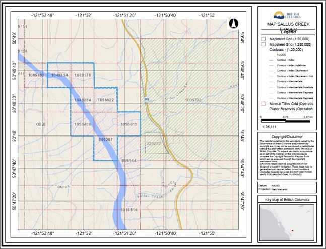 For sale. Large placer gold claim on the Fraser River north of Lillooet BC. Sallus Creek is made up of 7 titles. Long season here. Climate is very dry with very little rain or snow.