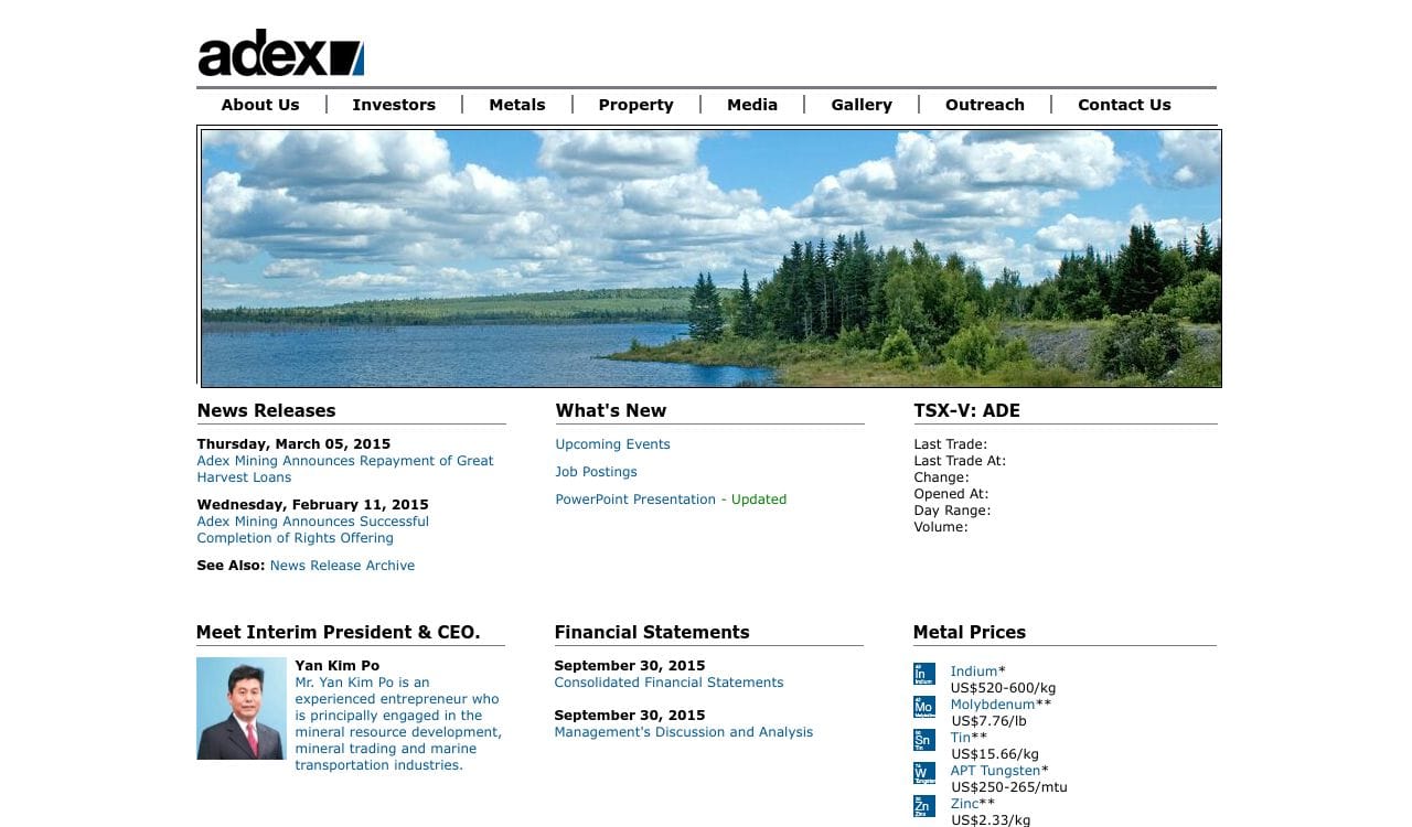 Adex Mining Inc. However, based on publicly available information, Adex Mining Inc. is a Canadian mining company that focuses on the exploration and development of mineral resources, particularly tin, tungsten, and indium.