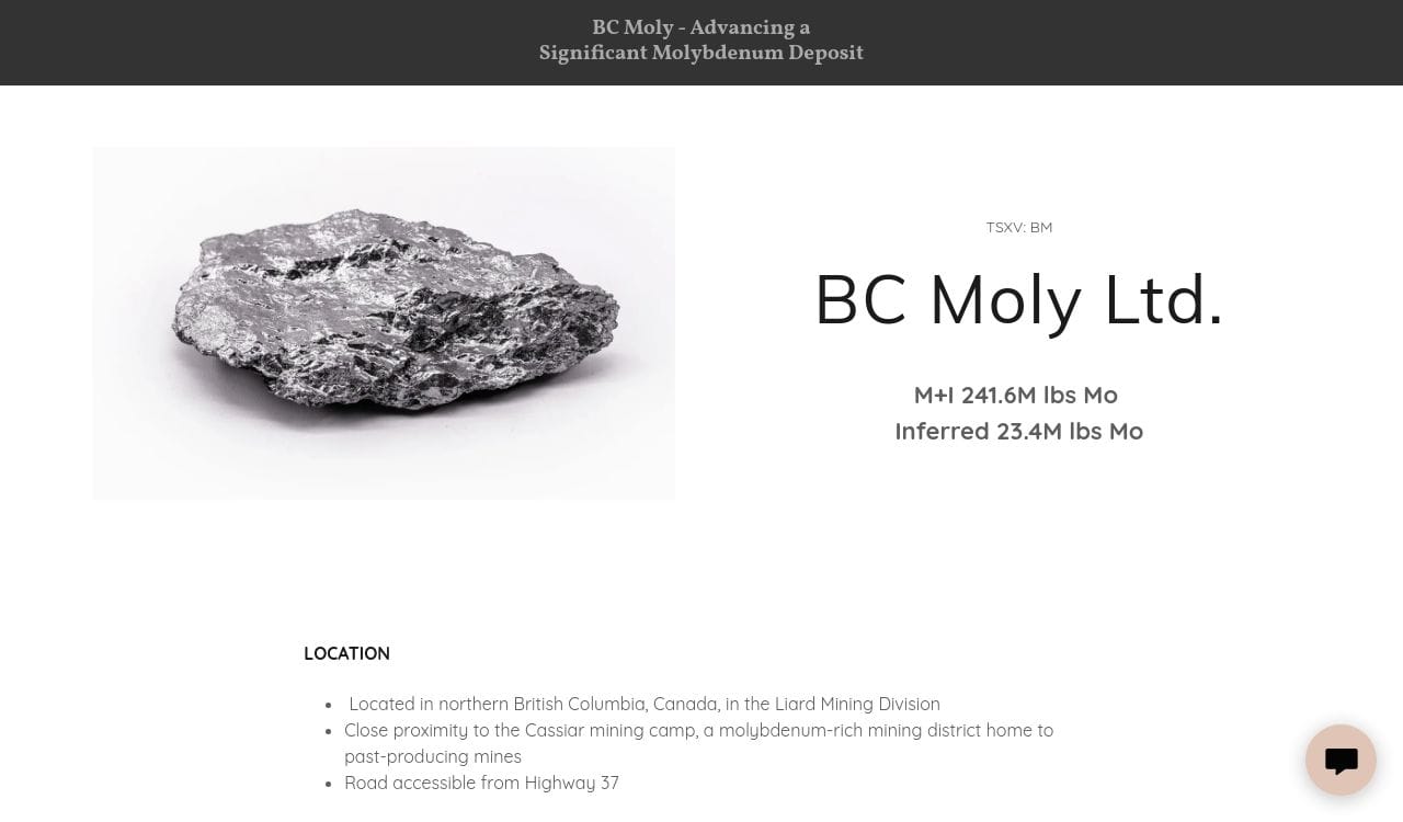 BC Moly Ltd. However, based on publicly available information, BC Moly Ltd is a mining company that focuses on exploring and developing molybdenum deposits in British Columbia, Canada.