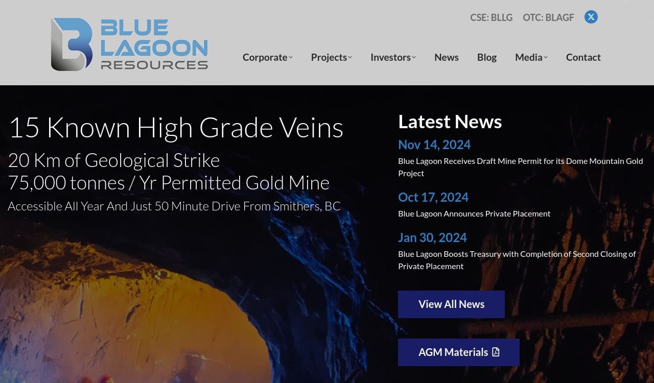 Blue Lagoon Resources Inc. is a Canadian mineral exploration company focused on the acquisition, exploration, and development of mineral properties in North America. The company's primary focus is on gold exploration and development, with a particular emphasis on the high-grade gold potential of the Golden Triangle region in British Columbia. Blue Lagoon's flagship property is the Dome Mountain Gold Project, which covers over 16,000 hectares and has a historical resource estimate of 3.0 million tonnes grading 7.5 g/t gold and 2.5 g/t silver. The company is also exploring several other properties in British Columbia and Ontario, including the Pellaire and Big Onion properties. Blue Lagoon Resources Inc. is listed on the Canadian Securities Exchange under the ticker symbol BLLG.