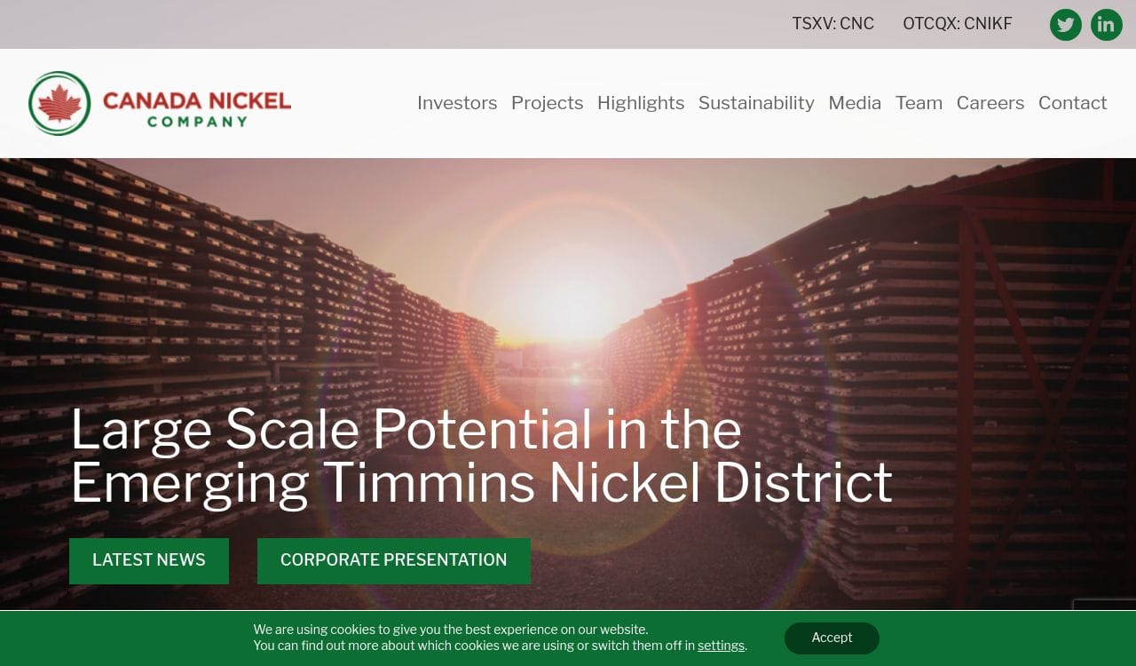 Canada Nickel Company Inc. is a Canadian mining company focused on the exploration and development of nickel-cobalt sulphide deposits in Ontario, Canada. The company's flagship project is the Crawford Nickel-Cobalt Sulphide Project, which is located in the Timmins-Cochrane mining camp in northern Ontario. The project has the potential to become one of the largest nickel-cobalt sulphide deposits in the world, with an estimated resource of over 600 million tonnes. Canada Nickel Company Inc. is committed to sustainable mining practices and has a strong focus on environmental, social, and governance (ESG) initiatives.