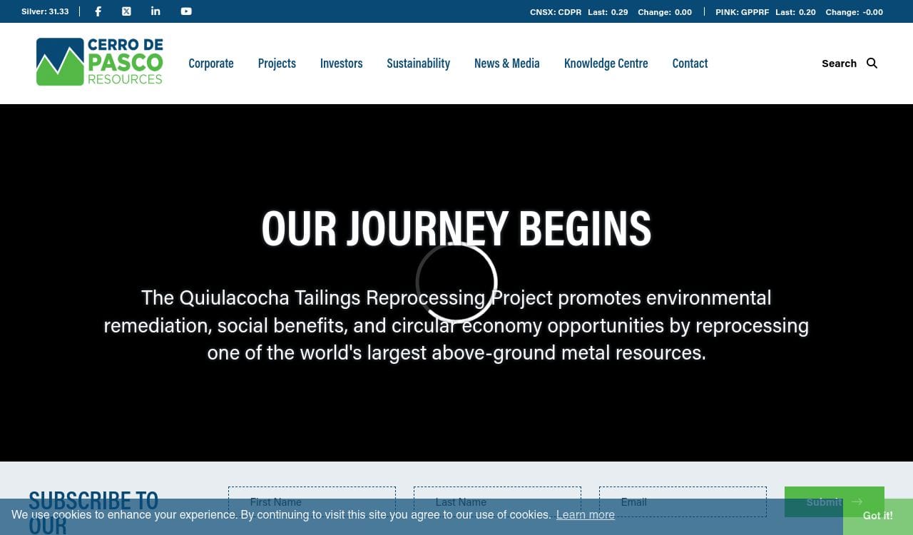 Cerro de Pasco Resources Inc. is a resource management company, founded in 2012 and publicly listed in Canada in 2018, with the purpose of treating and reprocessing all dumps, tailings, mining waste and material resources in the Cerro de Pasco Region in Peru.