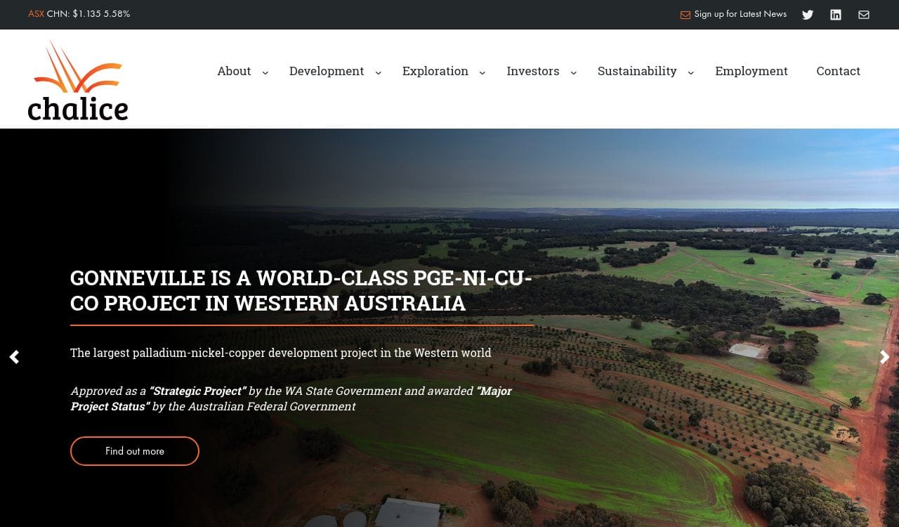 Chalice Mining Limited is an Australian mineral exploration company that focuses on the discovery and development of high-grade copper, nickel, and gold deposits. The company's primary project is the Julimar Project, located in Western Australia, which has shown significant potential for high-grade nickel, copper, and platinum group element mineralization. Chalice Mining Limited is listed on the Australian Securities Exchange (ASX: CHN) and the Toronto Stock Exchange (TSX: CXN).