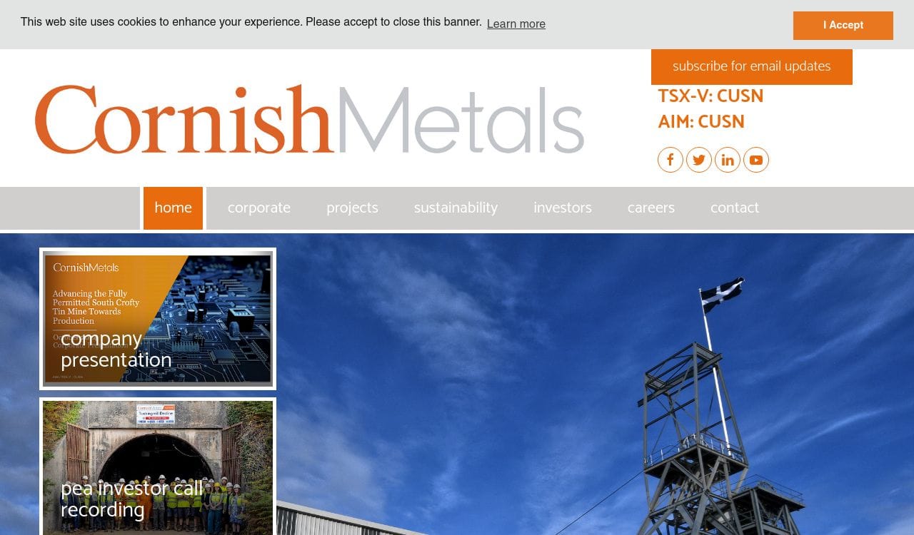 Cornish Metals Inc. is a Canadian mineral exploration and development company focused on the exploration and development of its mineral projects in Cornwall, United Kingdom. The company's primary focus is on the South Crofty tin project, which is one of the largest and most significant tin mines in the world. The company is also exploring for copper, zinc, and other base metals in the region. Cornish Metals is committed to sustainable and responsible mining practices and has a strong focus on community engagement and environmental stewardship. The company is listed on the TSX Venture Exchange under the symbol CUSN.