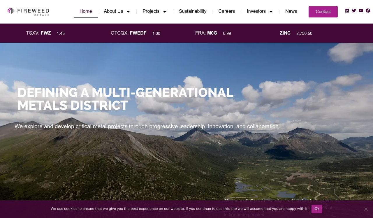 Fireweed Metals Corp is a Canadian mineral exploration company that focuses on the exploration and development of precious and base metals in the Yukon Territory of Canada. The company's flagship project is the Macmillan Pass Project, which is located in the southeast Yukon Territory and covers an area of approximately 544 square kilometers. The project is known for its high-grade zinc, lead, and silver deposits, as well as its potential for copper and gold. Fireweed Metals Corp is committed to responsible and sustainable mining practices and works closely with local communities and stakeholders to ensure that its operations have a positive impact on the environment and the local economy.