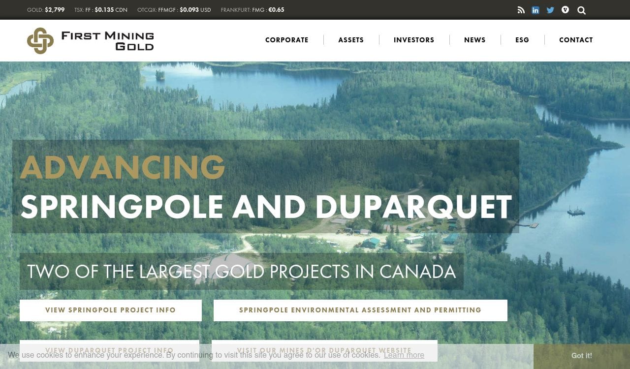 First Mining Gold Corp. is a Canadian gold developer focused on the development and permitting of the Springpole Gold Project in northwestern Ontario.