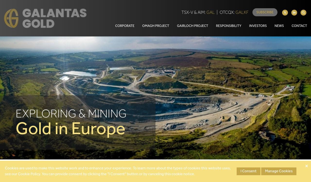 Galantas Gold Corporation is a public company, dual listed on the TSX Venture Exchange and the London Stock Exchange AIM market, which is developing an underground gold mine near Omagh, County Tyrone, Northern Ireland.
