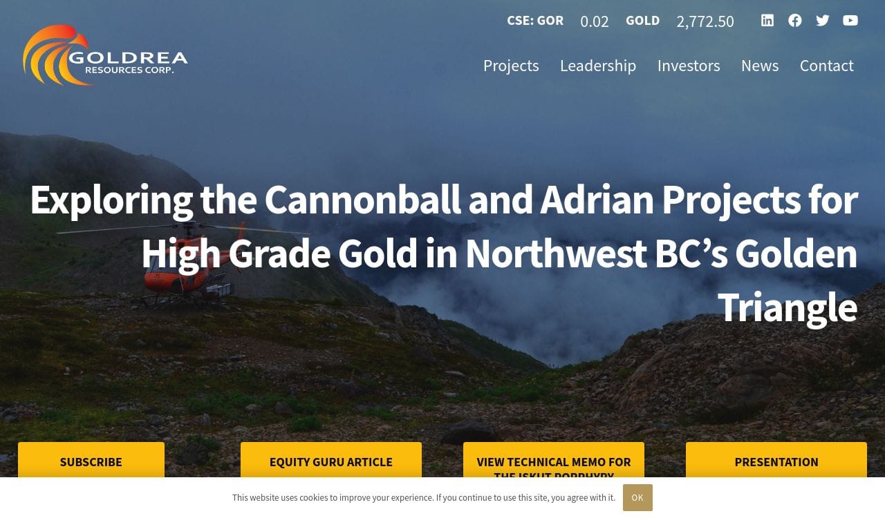 Goldrea Resources Corp is a Canadian mineral exploration company that focuses on the acquisition, exploration, and development of mineral properties in North America. The company's primary focus is on gold and copper exploration, with a particular emphasis on the exploration of the Cannonball and Gold Dome properties in British Columbia. Goldrea Resources Corp was founded in 2007 and is headquartered in Vancouver, British Columbia. The company is publicly traded on the Canadian Securities Exchange under the ticker symbol GOR.