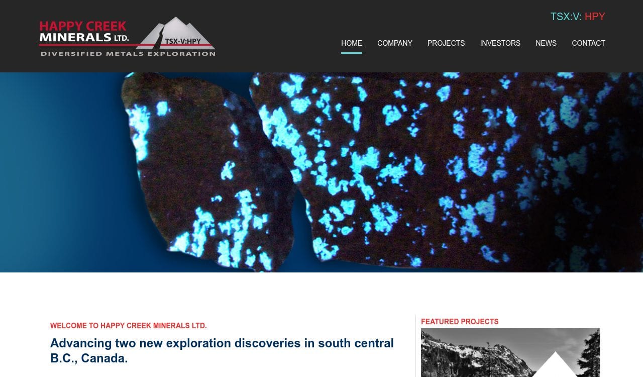 Happy Creek Minerals Ltd. is a mineral exploration company focused on the exploration and development of its mineral properties in British Columbia, Canada.