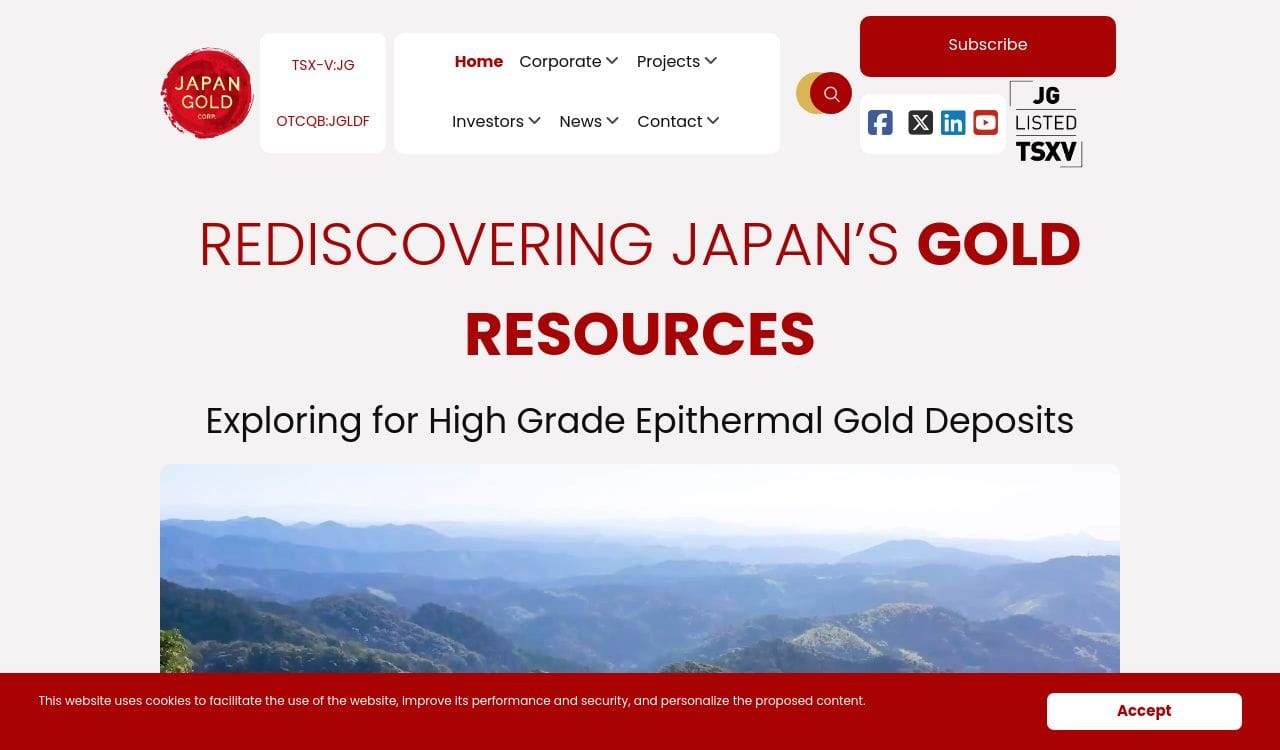 Japan Gold Corp is a Canadian mineral exploration company that focuses on gold exploration in Japan. The company was founded in 2016 and is headquartered in Vancouver, British Columbia. Japan Gold Corp has a portfolio of 31 projects covering a total area of 69,505 hectares in Japan. The company's exploration activities are focused on the three main islands of Japan: Hokkaido, Honshu, and Kyushu. Japan Gold Corp is committed to exploring and developing high-quality gold projects in Japan, which is a highly prospective region for gold exploration due to its rich history of gold mining and geological potential. The company's goal is to become the leading gold exploration and development company in Japan.