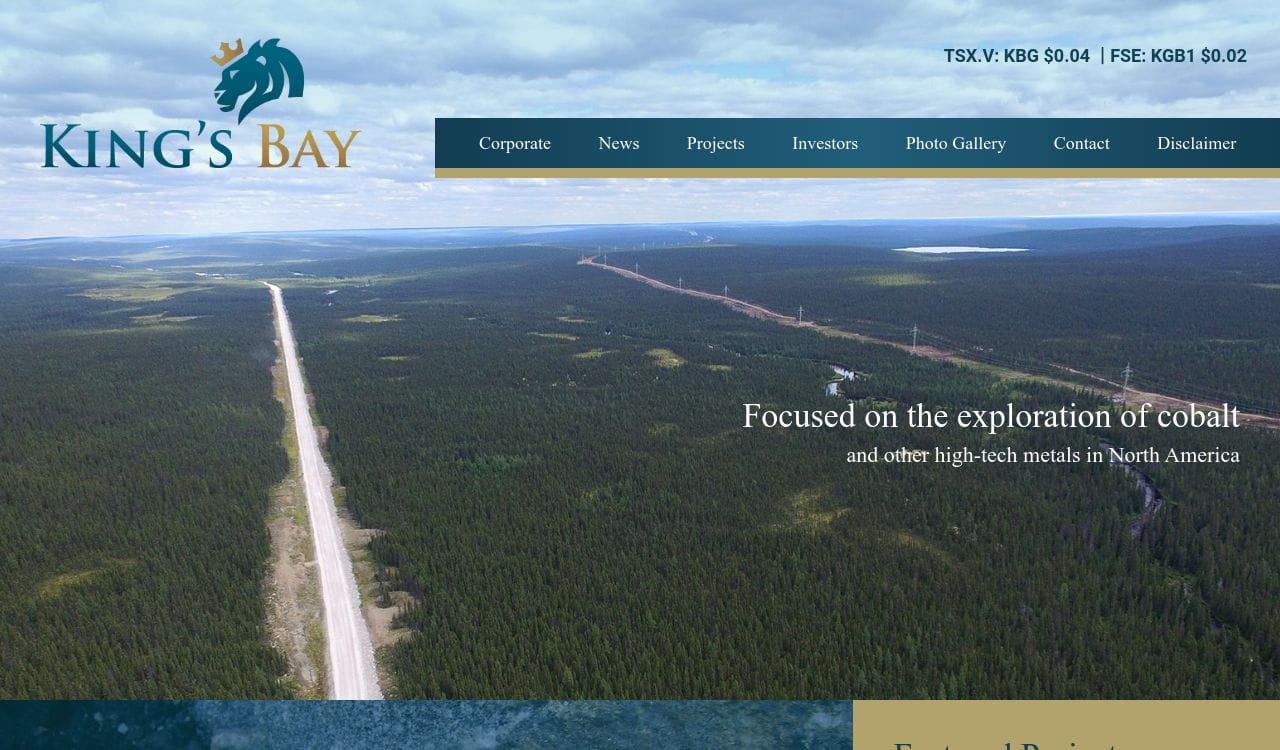 Kings Bay Resources Corp is a Canadian-based mineral exploration company that focuses on the exploration and development of mineral properties in North America. The company's primary focus is on the exploration of copper, cobalt, and other base metals. Kings Bay Resources Corp is headquartered in Vancouver, British Columbia, and is listed on the Canadian Securities Exchange (CSE) under the ticker symbol KBG. The company's current projects include the Lynx Lake Copper-Cobalt Project in Newfoundland and Labrador, Canada, and the Trump Island Copper Project in Alaska, USA. Kings Bay Resources Corp is committed to responsible and sustainable exploration practices and aims to create value for its shareholders through the discovery and development of high-quality mineral resources.