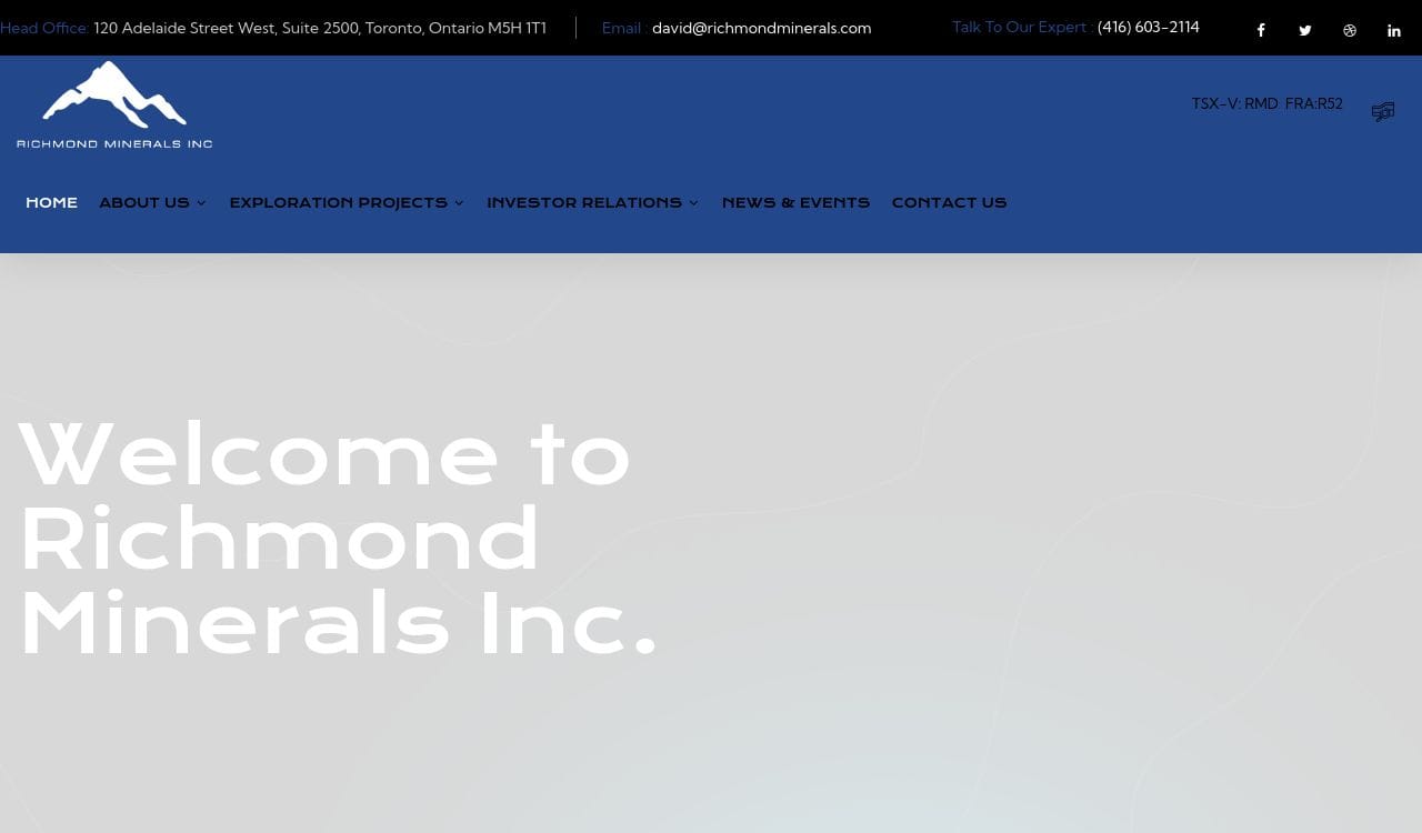 Richmond Minerals Inc. was founded in 2007 and is headquartered in Toronto, Canada. The company is publicly traded on the Canadian Securities Exchange (CSE) under the ticker symbol RMD.
